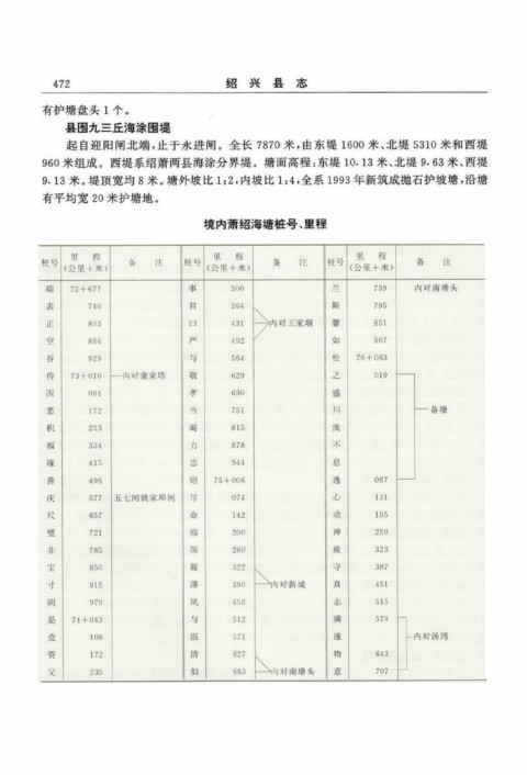 有护塘盘头1个。 县围九三丘海涂围堤 起自迎阳闸北端,止于永进闸。全长7870米,由东堤1600米、北堤5310米和西堤 960米组成。西堤系绍萧两县海涂分界堤。塘面高程:东堤10.13米、北堤9.63米、西堤 9.13米。堤顶宽均8米。塘外坡比1∶ 2,内坡比1∶ 4,全系1993年新筑成抛石护坡塘,沿塘 有平均宽20米护塘地。 境内萧绍海塘桩号、里程