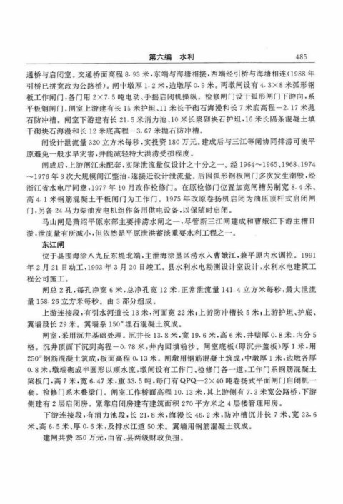 通桥与启闭室。交通桥面高程8.93米,东端与海塘相接,西端经引桥与海塘相连(1988年