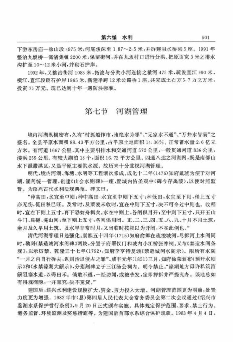 建国后,绍兴水利建设规模扩大,资金、劳力投入大增。河湖管理范围更为明确,处置