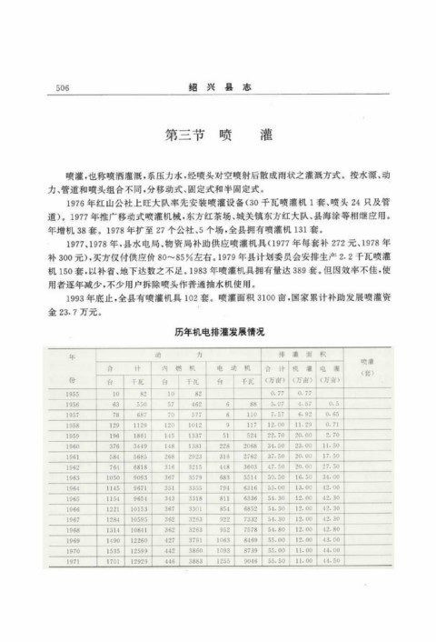 年增机38套。1978年扩至27个公社、5个场,全县拥有喷灌机131套。
