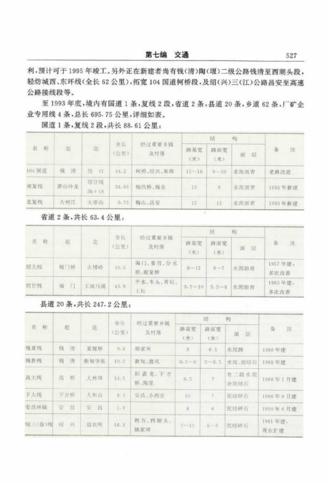 利,预计可于1995年竣工。另外正在新建者尚有钱(清)陶(堰)二级公路钱清至西湖头段, 轻纺城西、东环线(全长62公里),拓宽104国道柯桥段,及绍(兴)三(江)公路昌安至高速 公路接线段等。 至1993年底,境内有国道1条,复线2段,省道2条,县道20条,乡道62条,厂矿企 业专用线4条,总长695.75公里,详细如表。 国 道 1 条 , 复 线 2 段 , 共 长 8 8 . 6 1 公 里 : 省道2条,共长63.4公里: 县道20条,共长247.2公里: