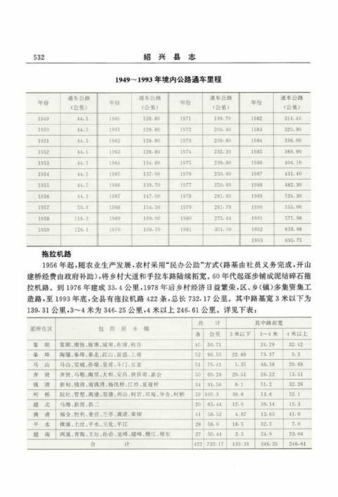 1949~ 1993年境内公路通车里程 拖 拉 机 路 1956年起,随农业生产发展,农村采用“民办公助”方式(路基由社员义务完成,开山 建桥经费由政府补助),将乡村大道和手拉车路陆续拓宽。60年代起逐步铺成泥结碎石拖 拉机路。到1976年建成33.4公里,1978年后乡村经济日益繁荣,区、乡(镇)多集资集工 造路,至1993年底,全县有拖拉机路422条,总长732.17公里。其中路基宽3米以下为 139. 31公里,3~米为346. 25公里,4米以上246. 61公里。详见下表: 4