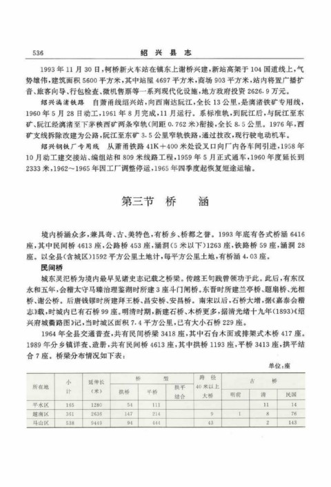 座,其中民间桥4613座,公路桥453座,涵洞(5米以下)1263座,铁路桥59座,涵洞28