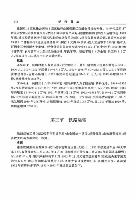 旅客运量 民国时期人畜力运输,无完整统计。萧绍、绍曹蒿公司通车时每天500~