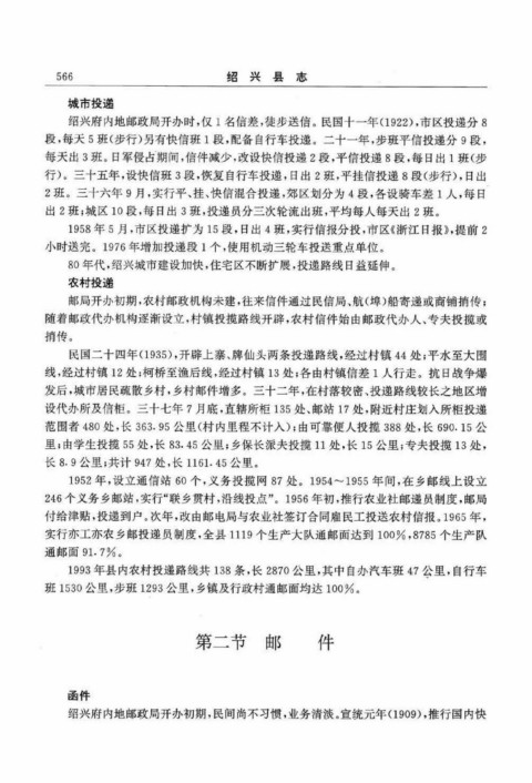 行)。三十五年,设快信班3段,恢复自行车投递,日出2班,平挂信投递8段(步行),日出