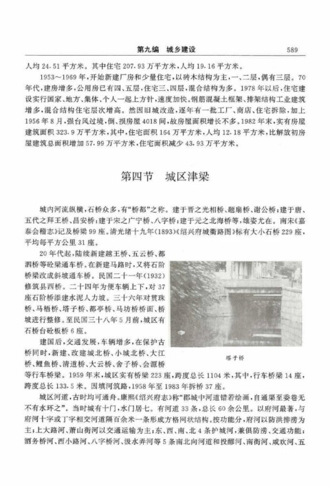 等行车桥梁。1959年末,城区实有桥梁223座,跨度总长1104米,其中,行车桥梁14座,