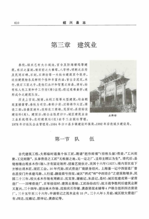方桥出现木匠、泥匠工会。3 0 年代始,西式营造厂商跻身绍兴。上海潘一记中西营造厂曾