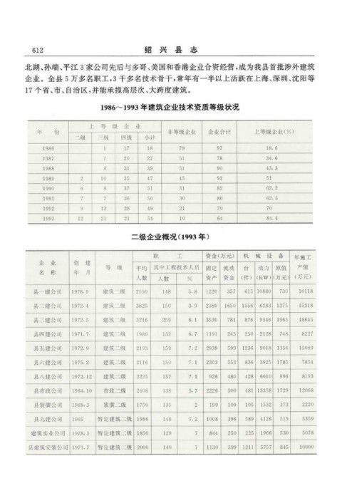 北湖、孙端、平江3家公司先后与多哥、美国和香港企业合资经营,成为我县首批涉外建筑 企业。全县5万多名职工,3千多名技术骨干,常年有一半以上活跃在上海、深圳、沈阳等 17个省、市、自治区,并能承揽高层次、大跨度建筑。 1 9 8 6 ~1 9 9 3 年 建 筑 企 业 技 术 资 质 等 级 状 况 二级企业概况(1993年)