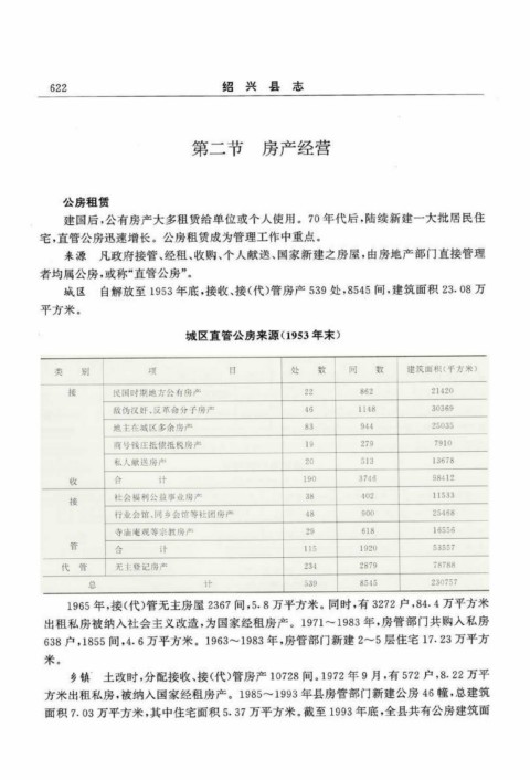 城区 自解放至1 9 5 3 年底,接收、接(代)管房产5 3 9 处,8 5 4 5 间,建筑面积2 3 .0 8 万