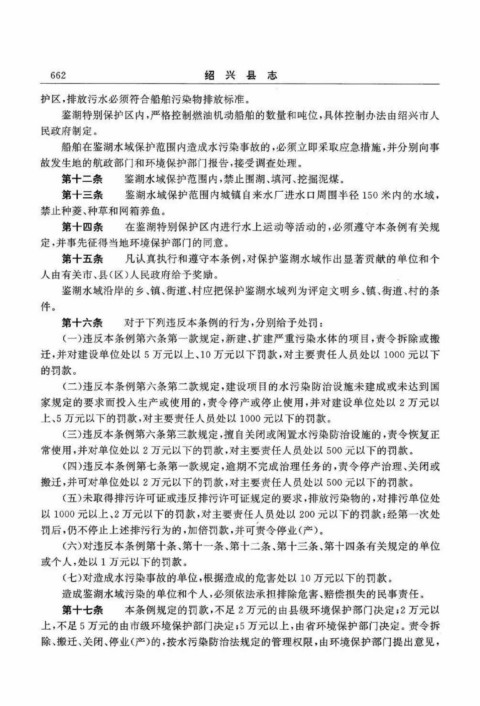 第十二条 鉴湖水域保护范围内,禁止围湖、填河、挖掘泥煤。