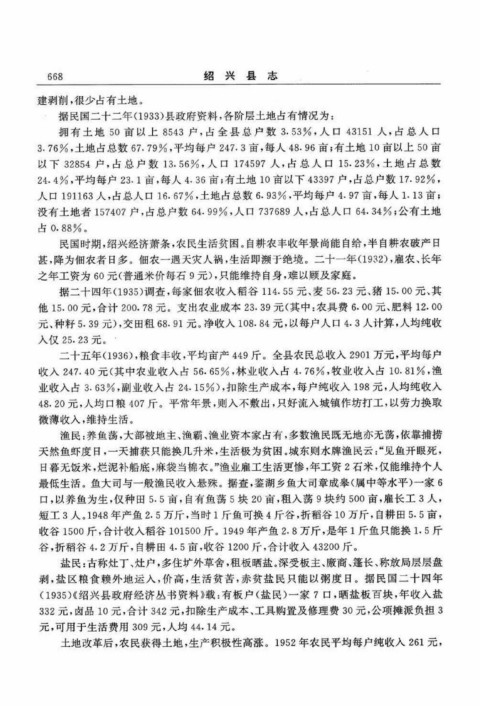 民国时期,绍兴经济萧条,农民生活贫困。自耕农丰收年景尚能自给,半自耕农破产日