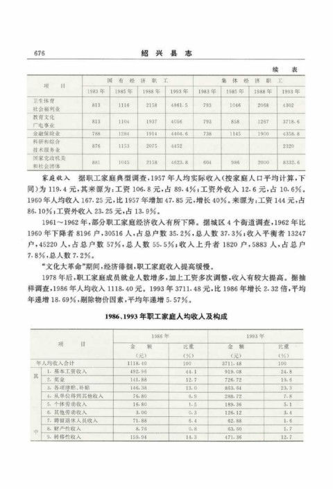1986、 1993年职工家庭人均收入及构成