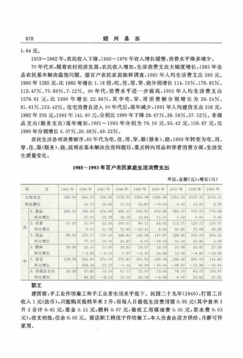 县农民基本解决温饱问题。据百户农民家庭抽样调查,1985年人均生活费支出589元。
