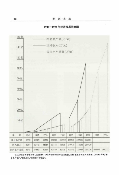 1949~ 1996年经济发展示意图 注:(1)按当年价格计算。(2)1949~1982年为原绍兴市(县)数据。1983年起为现绍兴县数据。(3)1993年起“社 会总产值”、“国民收入”两指标不作统计。