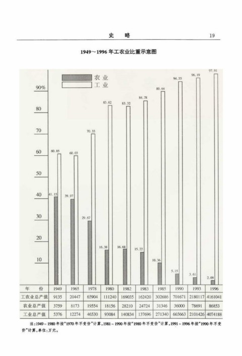 1949~ 1996年工农业比重示意图 注:1949~1980年按“1970年不变价”计算,1981~1990年按“1980年不变价”计算,1991~1996年按“1990年不变 价”计算,单位:万元。