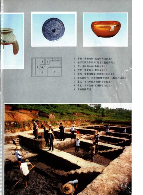 1 春秋·青铜鸠杖(漓渚坝头山出土) 2 越王句践自作用剑(湖北江陵望山出土) 3 晋·龙柄鸡头壶(禹陵乡出土) 4 西晋·青瓷谷仓(南池乡出土) 5 春秋·青铜屋模型(坡塘狮子山出土) 6 新石器时代·夹砂陶鱼鳍形足鼎(马鞍仙人山出土) 7 东汉·车马神仙画像镜(娄宫出土) 8 春秋·玉耳金舟(坡塘狮子山出土) 9 文物挖掘现场