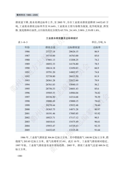 排放量下降袁废水处理达标率上升遥至 2005 年袁全市工业废水排放量降到 14432.65 万