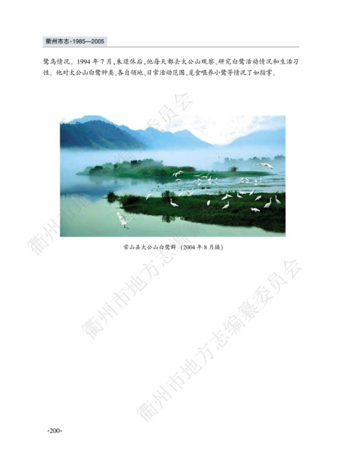 衢州市志窑1985要2005 鹭鸟情况遥 1994 年 7 月袁朱退休后袁他每天都去太公山观察尧研究白鹭活动情况和生活习 性遥 他对太公山白鹭种类尧各自领地尧日常活动范围尧觅食喂养小鹭等情况了如指掌遥 ````ᗭᇜ൧ֹٚᆽщቈჴ߶ ``ᗭᇜ൧ֹٚᆽщቈჴ߶ 常山县太公山白鹭群 渊2004 年 8 月摄冤 ᗭᇜ൧ֹٚᆽщቈჴ߶` 窑 200窑