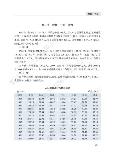 1985 年袁全市有 221.74 万人袁每平方公里 251 人遥 后人口总量继续上升袁但上升速度