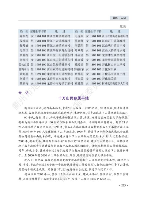 戴素梅 女 1904 101 龙游小南海镇丁家村 童桂英 女 1905 100 柯城花园街道下大门村