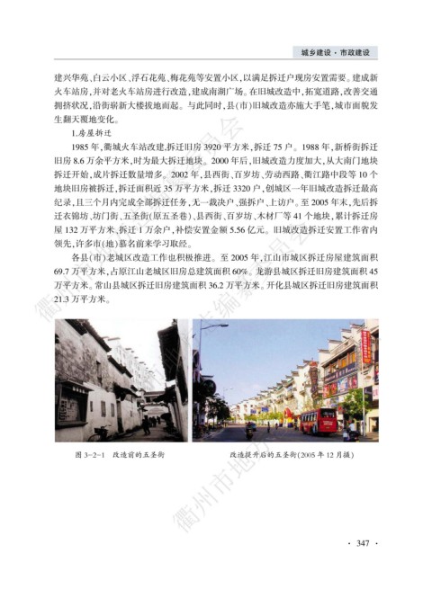 拆迁开始袁成片拆迁数量增多遥 2002 年袁县西街尧百岁坊尧劳动西路尧衢江路中段等 10 个