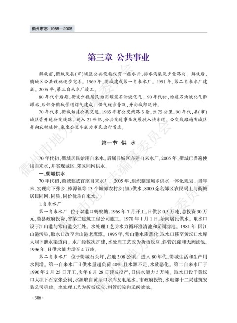 70 年代初袁衢城建成首座自来水厂遥 2005 年袁组织制定城乡供水一体化规划遥 当年
