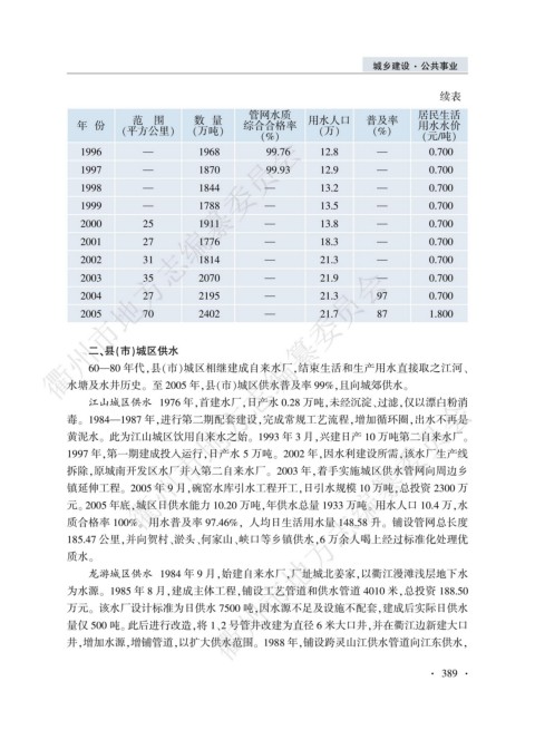 水塘及水井历史遥 至 2005 年袁县渊市冤城区供水普及率 99%袁且向城郊供水遥