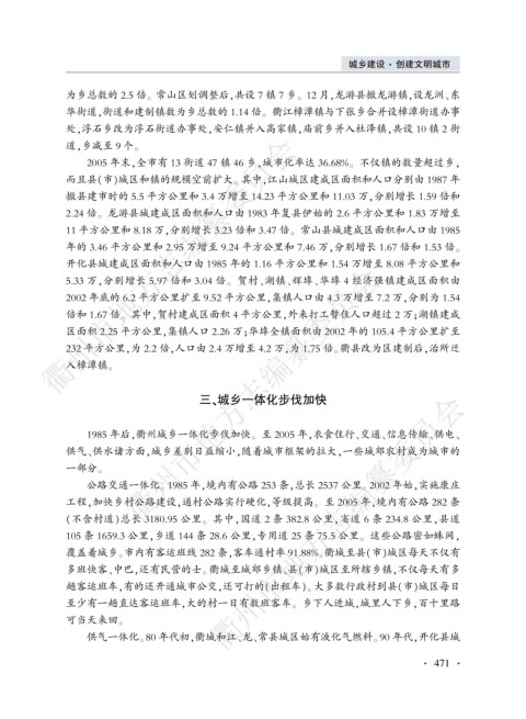 1985 年后袁衢州城乡一体化步伐加快遥 至 2005 年袁衣食住行尧交通尧信息传输尧供电尧