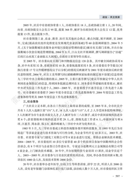 2005 年袁社员中有省政协常委 1 人袁市政协委员 18 人袁县政协副主席 1 人遥20 年间袁