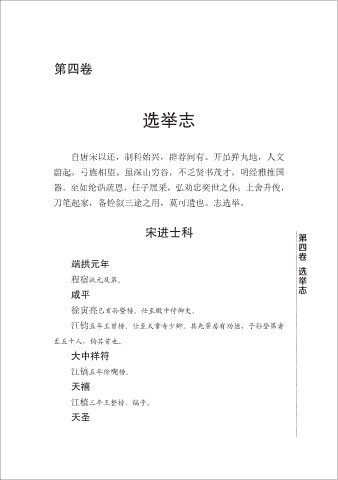 第四卷 选举志 自唐宋以还,制科始兴,辟荐间有。开虽弹丸地,人文 蔚起,弓旌相望。虽深山穷谷,不乏贤书茂才,明经雅推国 器。至如纶诰疏恩,任子展采,弘劝忠奕世之休;上舍升俊, 刀笔起家,备铨叙三途之用,莫可遗也。志选举。 宋进士科 端拱元年 第四卷 选举志 程宿状元及第。 咸平 徐寅亮已亥孙暨榜。仕至殿中侍御史。 江钧五年王曾榜。仕至太常寺少卿。其先景房有功德,子孙登第者 至五十人,钧其首也。 大中祥符 江镐五年徐奭榜。 天禧 江植三年王整榜,镐子。 天圣 111