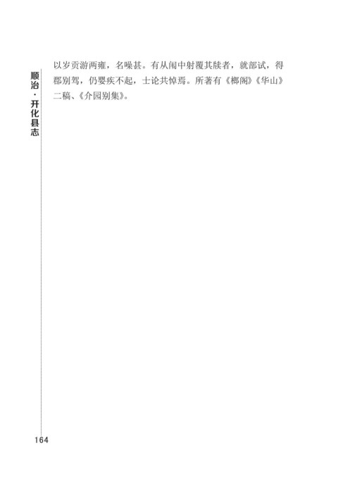 以岁贡游两雍,名噪甚。有从闱中射覆其牍者,就部试,得 郡别驾,仍婴疾不起,士论共悼焉。所著有《榔阁》《华山》 二稿、《介园别集》。 顺治·开化县志 164