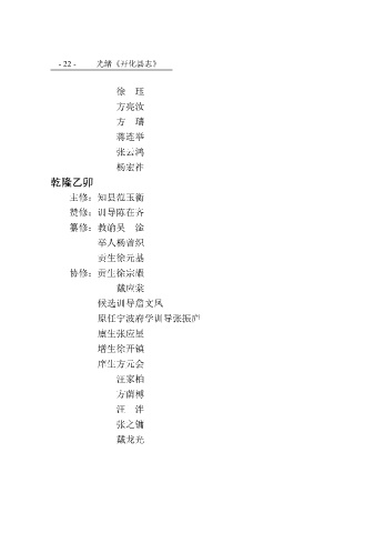 - 22 - 光绪《开化县志》 徐 珏 方亮汝 方 璹 蒋连举 张云鸿 杨宏祚 乾隆乙卯 主修:知县范玉衡 赞修:训导陈在齐 纂修:教谕吴 淦 举人杨曾织 贡生徐元基 协修:贡生徐宗嘏 戴应棠 候选训导詹文凤 原任宁波府学训导张振庐 廪生张应星 增生徐开镇 庠生方元会 汪家柏 方荫榑 汪 泮 张之镛 戴龙光