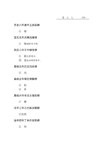卷 之 七 - 241 - 天圣八年庚午王拱辰榜 江 镃 宝元元年戊寅吕臻榜 江 铸鸿胪寺少卿。 庆历二年壬午杨宝榜 江 棣太常博士。 程 迪尚书都官郎中。 皇祐元年已丑冯京榜 江 校 皇祐五年癸巳郑獬榜 江 桧 江 朴 嘉祐六年辛丑王俊民榜 江 樵 洽平二年乙巳彭汝砺榜 江汝钦 治平四年丁未许安世榜 江 炜