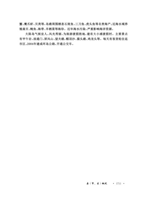 蟹、鹰爪虾、贝类等,岛礁周围栖息石斑鱼、三刀鱼、虎头鱼等名贵海产;近海水域养 殖扇贝、鲍鱼、海带、羊栖菜等海珍。近年海水污染,严重影响海洋资源。 大陈岛气候宜人,风光秀丽,为旅游渡假胜地,建有大小浦渡假村。主要景点 有甲午岩、浪通门、屏风山、望夫礁,帽羽沙、猫头礁、鸡龙头等。每天有客货轮往返 市区。2004年建成环岛公路,开通公交车。 县(市、区)概况 · 1711 ·