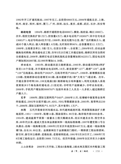全部通电话。2006年,路桥区电话交换机装机总容量增加到342251门,固定电话用