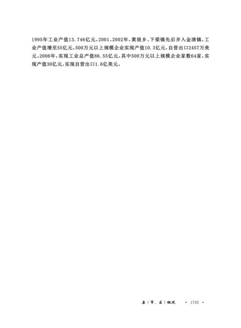 1995年工业产值13.746亿元,2001、2002年,黄琅乡、下梁镇先后并入金清镇,工 业产值增至55亿元,500万元以上规模企业实现产值10.3亿元,自营出口2457万美 元。2006年,实现工业总产值86.55亿元,其中500万元以上规模企业家数64家,实 现产值30亿元,实现自营出口1.6亿美元。 县(市、区)概况 · 1745 ·