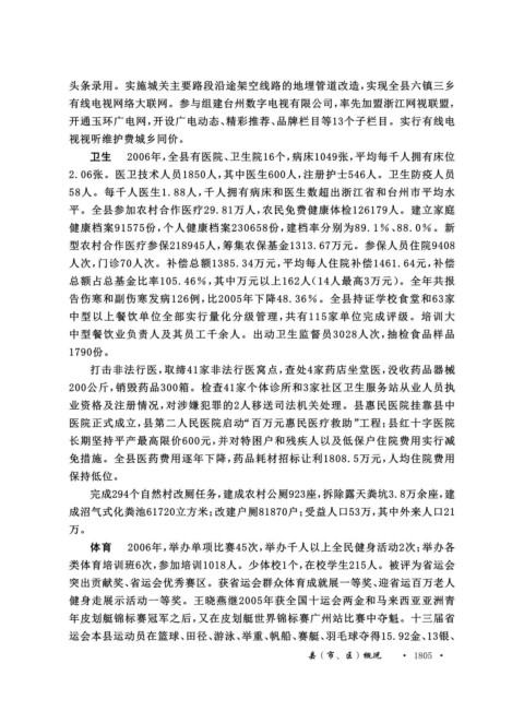 体育 2006年,举办单项比赛45次,举办千人以上全民健身活动2次;举办各