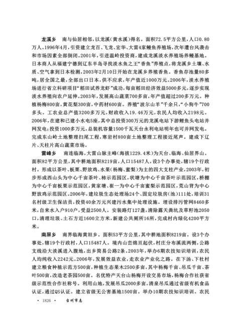 龙溪乡 南与仙居相邻,以龙溪(黄水溪)得名。面积72.5平方公里,人口0.80