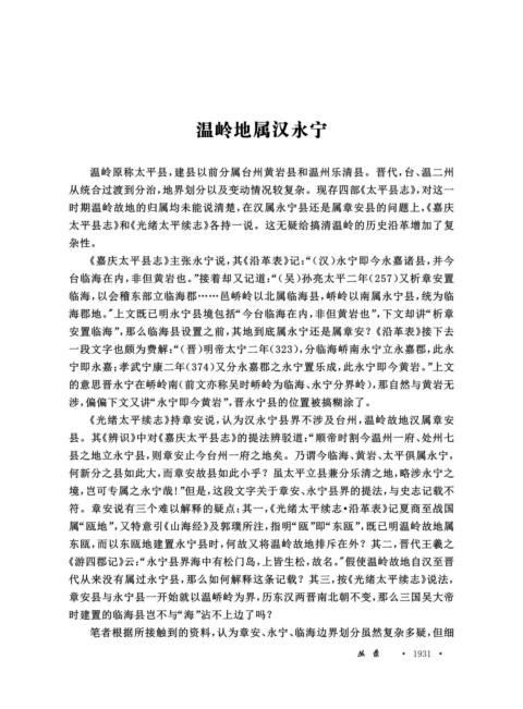 《光绪太平续志》持章安说,认为汉永宁县界不涉及台州,温岭故地汉属章安
