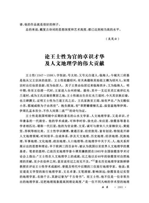 坚、苏轼等相比美。王士性学识渊博,兼通百家,经世致用,富有创设,特别是开辟