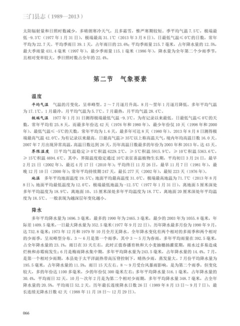 极端气温 1977 年 1 月 31 日测得极端最低气温 -9.3℃,为有记录以来最低。日最低气温≤ 0℃的天
