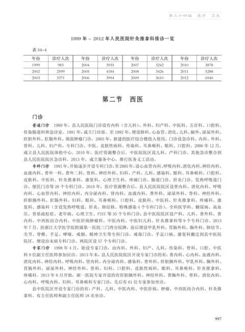 诊、便民门诊等 26 个专科门诊。2010 年,医疗资源整合后,县人民医院院区设普内科、消化内科、呼吸