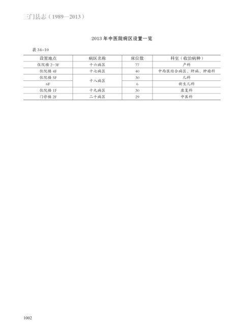 三门县志(1989—2013) 2013 年中医院病区设置一览 表 34-10 设置地点 病区名称 床位数 科室(收治病种) 住院楼 2-3F 十六病区 77 产科 住院楼 4F 十七病区 40 中西医结合病区、肝病、肿瘤科 住院楼 5F 30 儿科 十八病区 6F 6 新生儿科 住院楼 1F 十九病区 30 康复科 门诊楼 2F 二十病区 29 中医科 1002