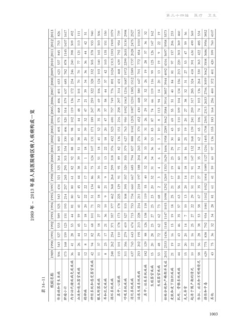 34-11 疾病名称 传染病和寄生虫病 内分泌代谢疾病免疫疾病 血液和造血器官疾病 神经系统和感觉器官疾病 心脏病 泌尿生殖系统疾病 泌尿系统疾病 生殖器官疾病 生殖器官疾病 妊娠分娩和产褥期并发症 皮肤和皮下组织疾病 肌肉、骨骼系统疾病 起源于围产期的情况 体征、症状和不明确情况