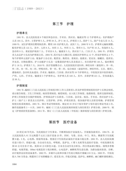 1991 年,县人民医院设 8 个病区和急诊室、手术室、供应室、输液室等 12 个护理单元,有护理助产