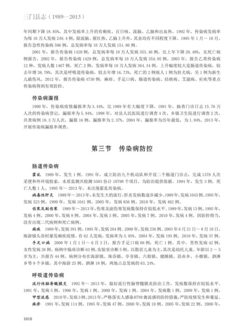 1990 年,传染病疫情漏报率为 3.44%,比 1989 年有大幅度下降。1991 年,抽查门诊日志 15.76 万