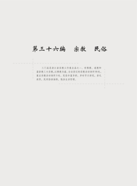 第三十六编 宗教 民俗 三门县是浙江省宗教工作重点县之一。有佛教、道教和 基督教三大宗教,以佛教为盛。合法登记的宗教活动场所 99 处, 重点宗教活动场所 9 处。民俗丰富多彩,岁时节日讲究,崇礼 尚贤,民间俗语独特,饱含生活哲理。