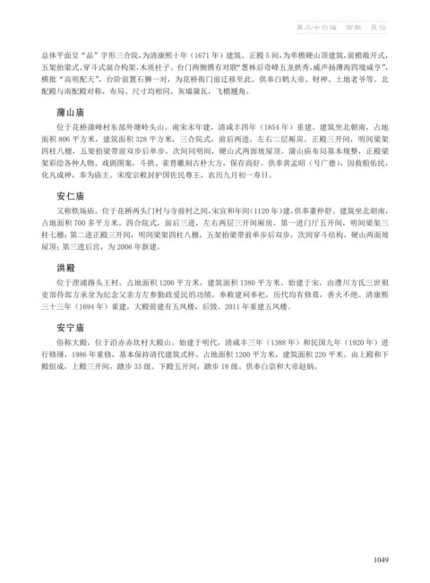 总体平面呈“品”字形三合院,为清康熙十年(1671 年)建筑。正殿 5 间,为单檐硬山顶建筑,前檐敞开式,