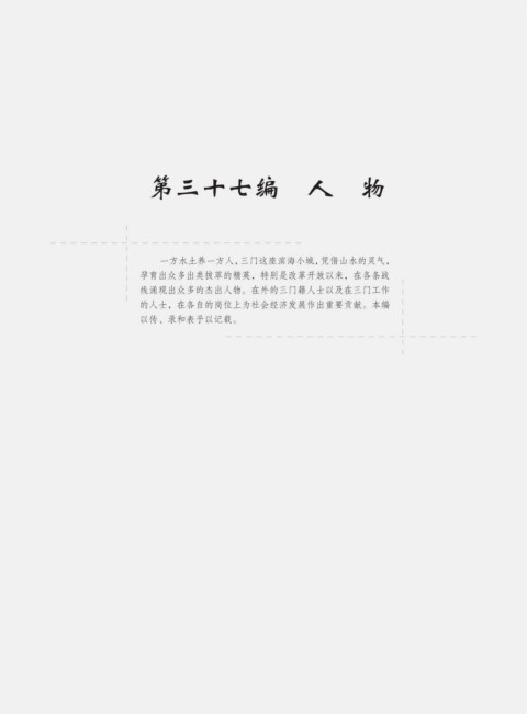第三十七编 人 物 一方水土养一方人,三门这座滨海小城,凭借山水的灵气, 孕育出众多出类拔萃的精英,特别是改革开放以来,在各条战 线涌现出众多的杰出人物。在外的三门籍人士以及在三门工作 的人士,在各自的岗位上为社会经济发展作出重要贡献。本编 以传、录和表予以记载。