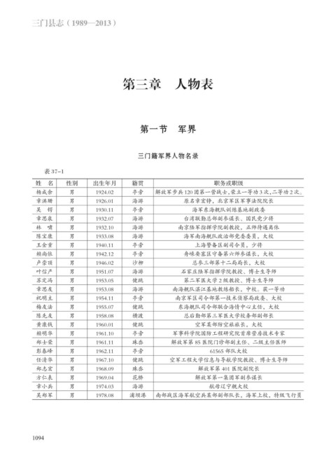 赖尚依 男 1942.12 亭旁 舟嵊要塞区守备第六师参谋长,大校
